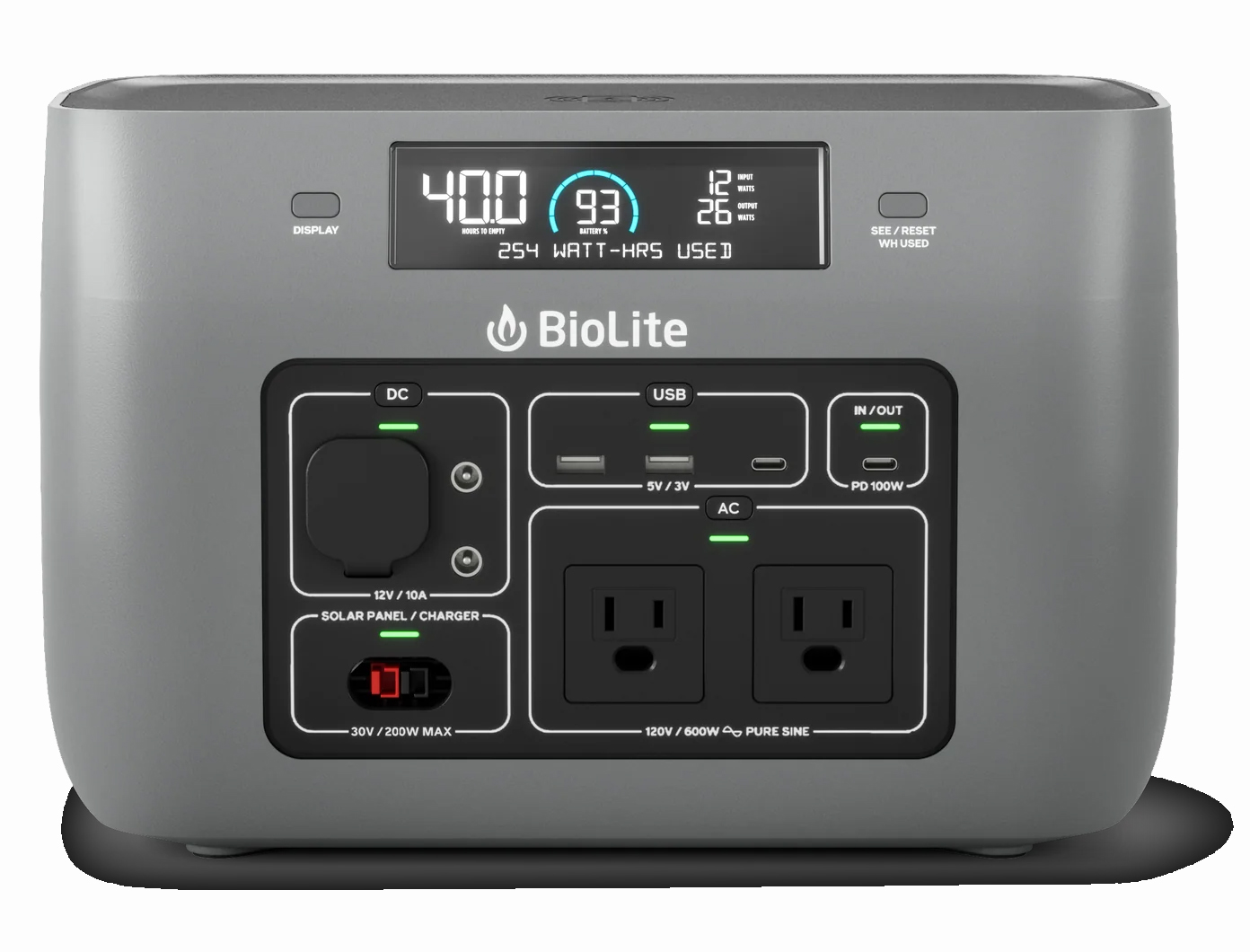 | Recharge Options | Wall outlet, BioLite SolarPanels, 12V car outlet (takes 2.5 hours in wall port to charge to 80%) |