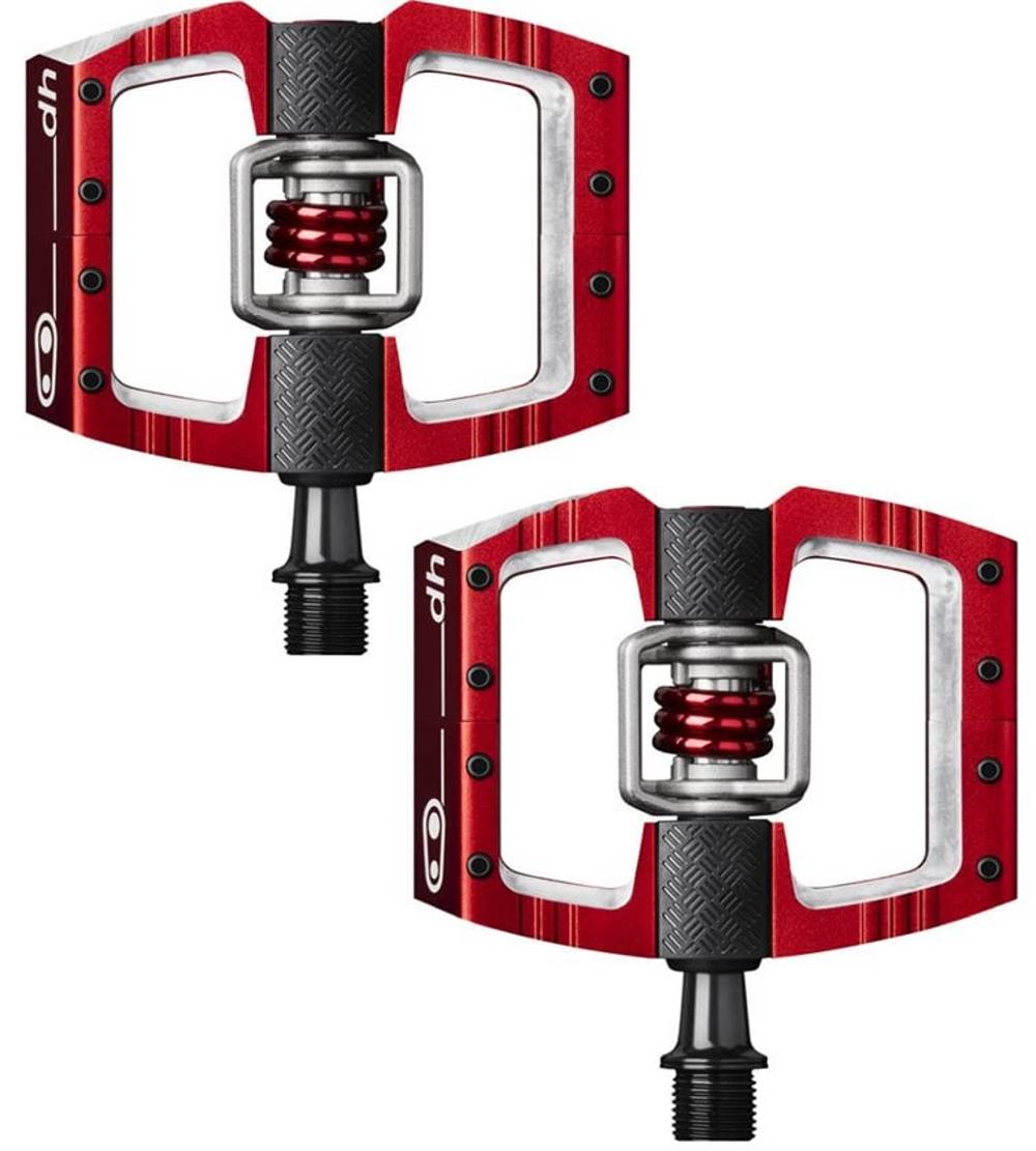 The new Mallet DH Pedals by Crank Brothers feature a concave platform for secure a foothold, and 8 adjustable pins per side for grip. They include traction pad technology with a customizable interface, and a ribbed body for better traction when unclipped, giving you peak versatility. Crank Bros. engineered chamfered edges to reduce rock-strikes, and machined a 57mm q-factor for maneuverability on tight trails. Clip in with ease using the 4-sided entry technology, and enjoy the superior mud shedding when the trails are sloppy.