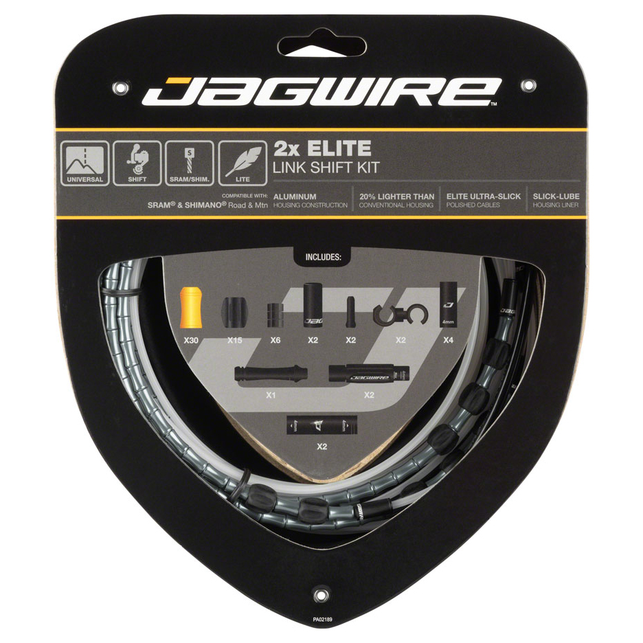 Experience the ultimate combination of durability and attention-grabbing looks with the Jagwire 2x Elite Link Shift Cable Kit. It’s been designed to improve shifting performance and look good while doing so. The Jagwire 2x Elite Link Shift Cable Kit uses a series of aluminum links to provide a compressionless system for precise shifting performance. But unlike typical compressionless housing, its flexibility allows for tight bends without kinking. It’s also lighter than traditional linear strand shift housing while being more durable. Combine these benefits with Elite, ultra-slick polished cables and Slick-Lube liners, and you’ve got the best of performance and style.