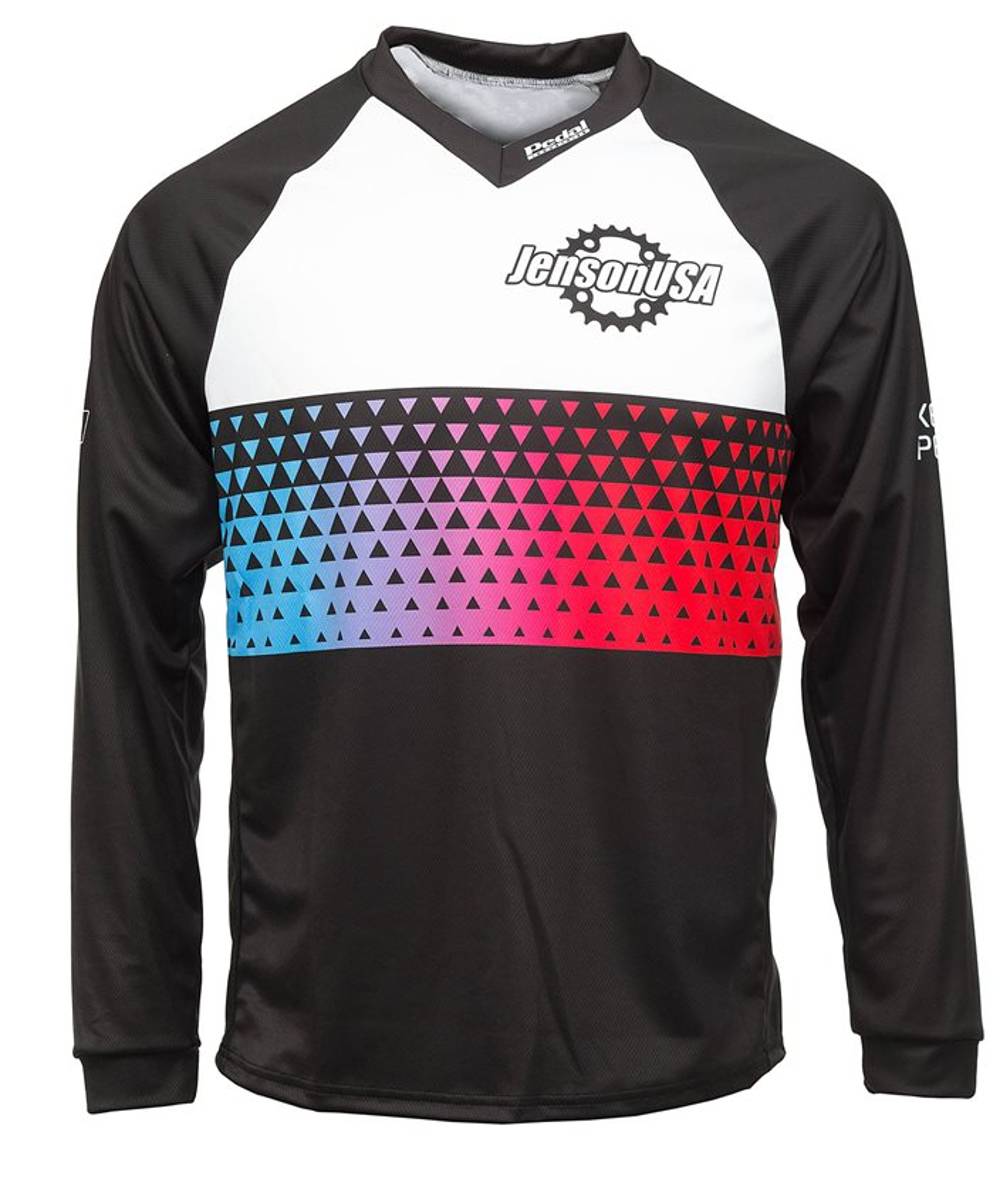 Built around a collective love for all things cycling, Jenson USA prides itself on inspiring people to ride, experience and explore. Whether you're seduced by the podium, inspired by the scenery, or motivated by fitness, Jenson Custom apparel is your motivator for getting out and pedaling. The Jenson custom jersey is a handsomely decorated mountain jersey with Jenson USA's logo and "Keep Pedaling" mantra in a classic colorway. Made from lightweight, moisture wicking material that keeps you cool in the heat of the moment, while a loose fit and roomy V-neck leaves space for padding. Go hit the trails in style and fly your Jenson USA colors on the dirt.