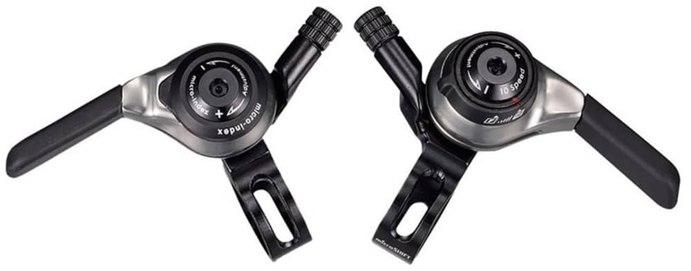 MicroShift Flat Bar Shifters are just what the minimalist ordered! These low-profile thumb shifters are perfect for everything from your retro-inspired townie build to a bikepacking rig built to withstand the apocalypse. Simple operation and a classy, straightforward aesthetic are matched with efficient performance and the versatility of switching between friction or indexed shifting (for the rear shifter). The front shifter operates in a micro friction mode that works with both double and triple cranks. The rear shifter is dealer's choice. Run it in friction for that classic feel or switch it into indexed for a precise modern shifting experience. Though these shifters are designed to work with modern 10 speed indexed drivetrains, setting them up in the friction only mode allows you to pair them up with 5-8 speed drivetrains as well.