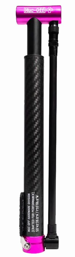 Whether you're cruising on a short ride or you're going out for an all-day adventure, you should always have a hand pump with you. Staying prepared will keep you riding if you get a flat. The Muc-Off AirMach Carbon Pump is crafted with precision from high-quality carbon fiber and CNC-machined aero-grade aluminum. The AirMach Carbon is designed to be lightweight, compact, and super strong. It features a 304 stainless steel foot stand, a reversible CNC-machined valve head that is compatible with Presta and Schrader valves, and a flexible hose that clips into the handle.