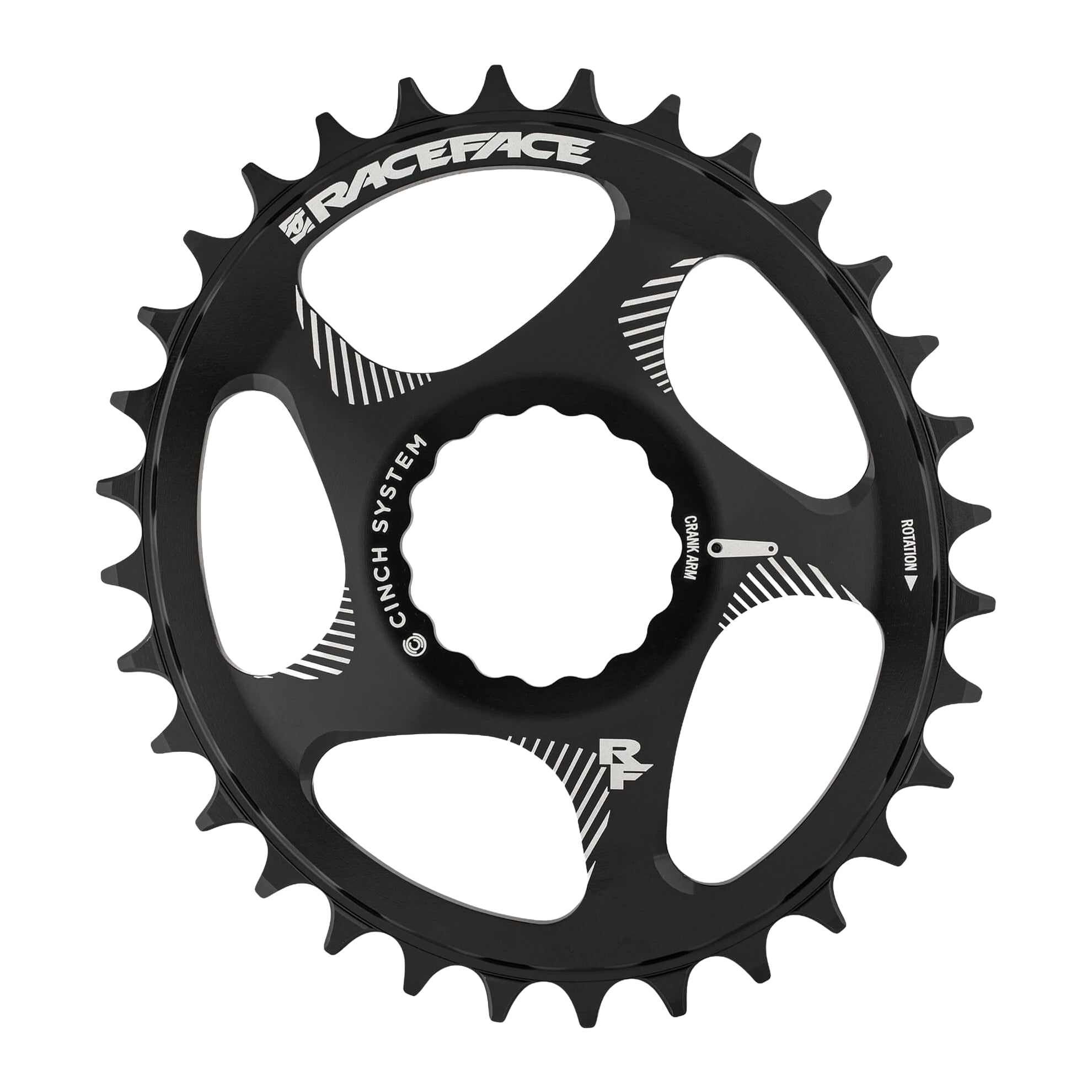 The Race Face Cinch Oval Chainring is a high-tech chainring for advanced modern 1x drivetrains, for a secure hold to reduce chain drop, and an advanced ovalized design for improved pedaling efficiency. The chainring is crafted from a 7075 alloy plate, increasing stiffness and strength with minimal weight, and it utilizes a direct mount CINCH crankset interface for quick and reliable installation. The ovalized shaping of the chainring helps to increase power in weak spots through the rider’s pedal stroke, for a smoother pedaling circle and increased efficiency.