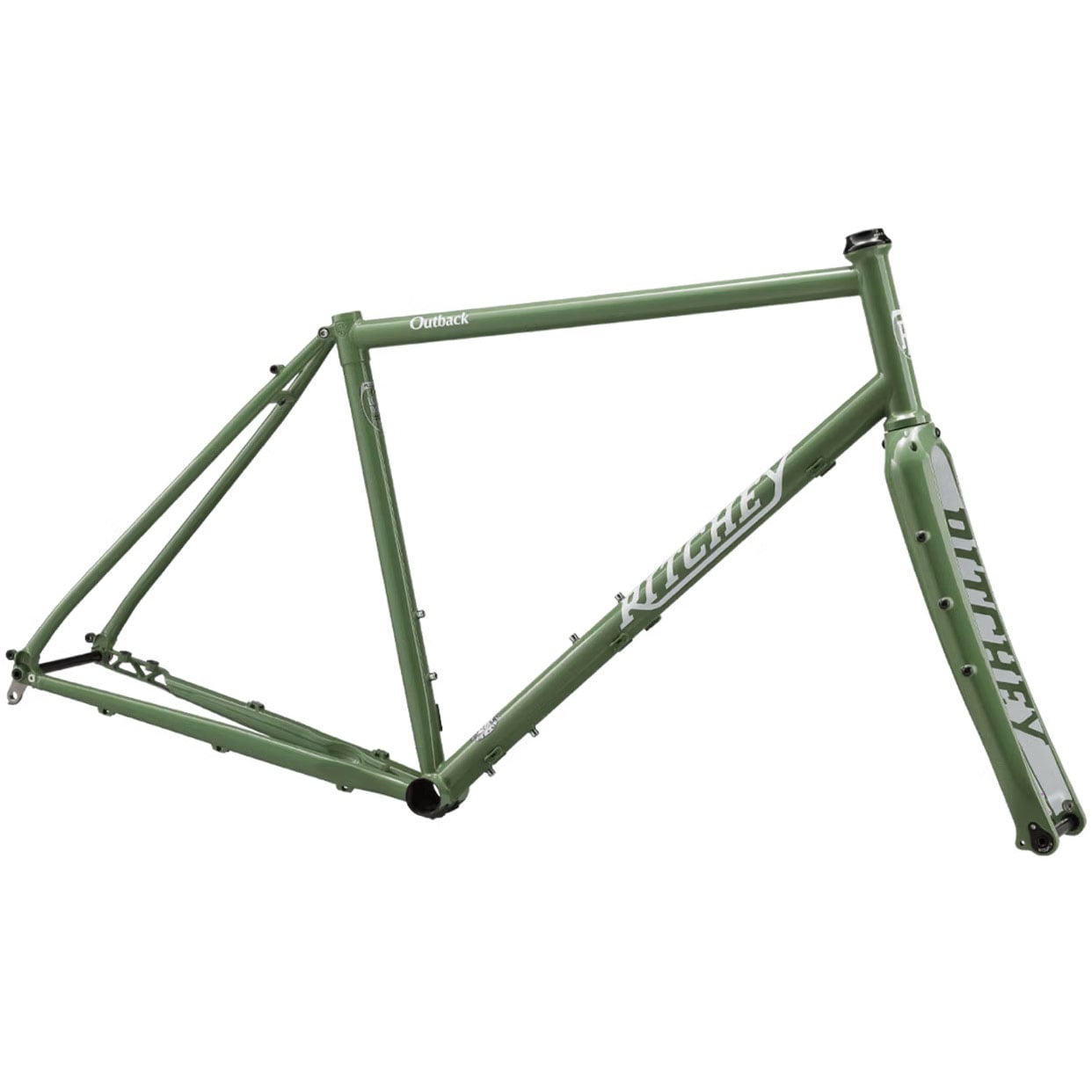 The Ritchey Outback Frameset is designed for bikepacking road off-road trail expedition and more. It features rack and fender mounts help to keep things dry and expand the load-carrying capacity for longer bikepacking adventures while clearance for 700c x 48mm or 650b x 2.0" tires opens up a whole new world of possibilities. Doubling down on the Outback’s practical performance an all-carbon fiber Ritchey Adventure Fork with multi-purpose mounts on the legs gives you more places to stow supplies. The Outback is TIG-welded with proprietary triple-butted Ritchey Logic steel tubing that now sports an updated one-piece truss design for flat mount brakes significantly reducing chainstay weight.