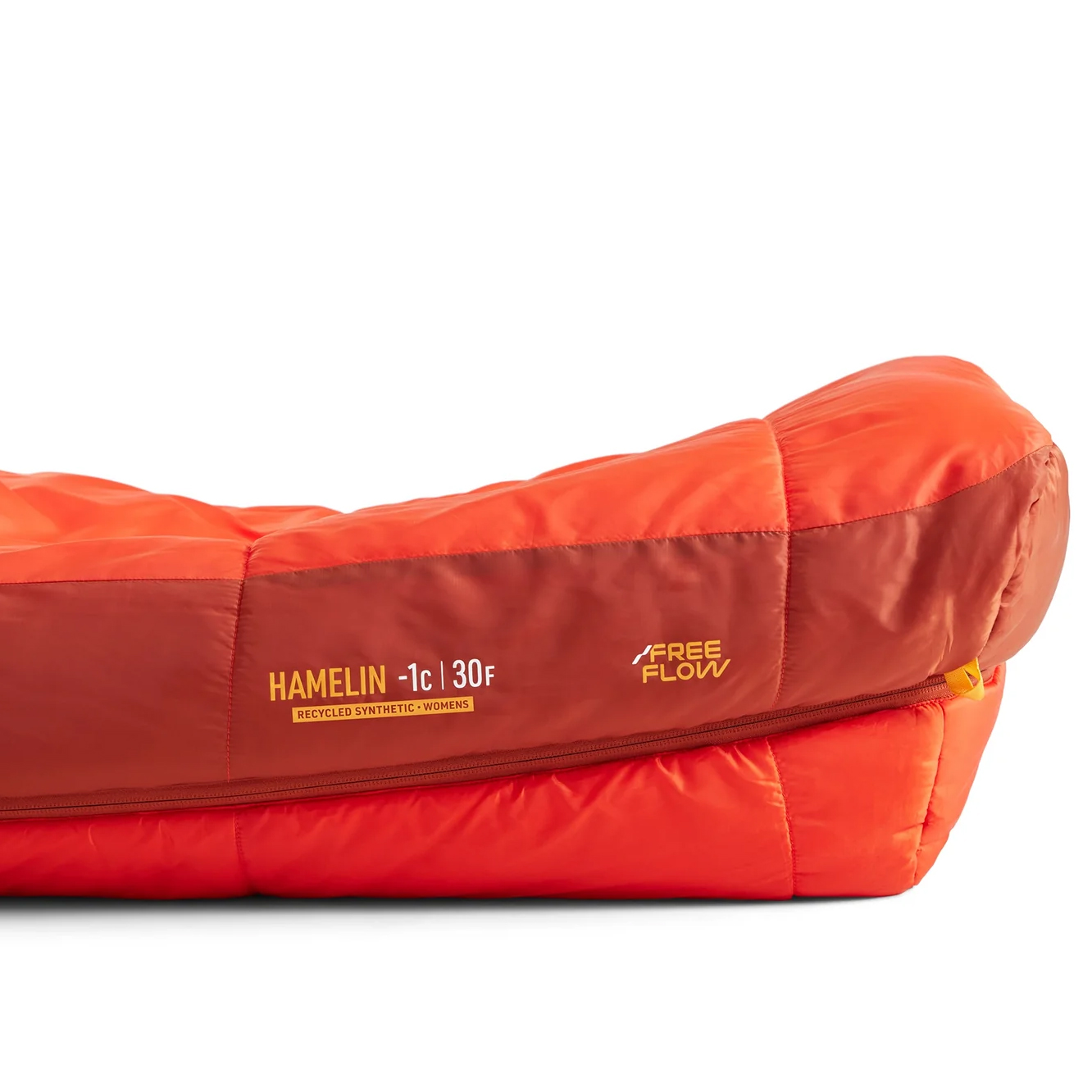 Designed specifically for female backpackers, the Hamelin Women's Synthetic Sleeping Bag 30°F offers reliable warmth in various climates, even when damp. Its contour shape provides room to move, making it ideal for side sleepers. The full-length side zipper allows for custom ventilation and lets you open the bag flat as a quilt. Made with recycled materials and a water-repellent finish, this bag ensures comfort and sustainability on your trips.