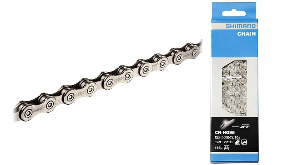 The HG95 is Shimano's new XT-level chain specifically designed to work with the Dyna-Sys 10 speed MTB drivetrains and features Shimano's new ultra-low friction surface treatment, "SIL-TEC". Thanks to this new surface treatment, XT chains will now operate smoother with less friction resulting in less noise, requiring less maintenance with better mud shedding performance, and lasting longer than before with better wear and abrasion resistance. The new "SIL-TEC" coating paired with Shimano's Dyna-Sys 10 speed system means closer ratios, smoother shifts, and a more stable pedal stroke. This chain is directional for maximum shifting performance, for use with Dyna-Sys cassettes only.