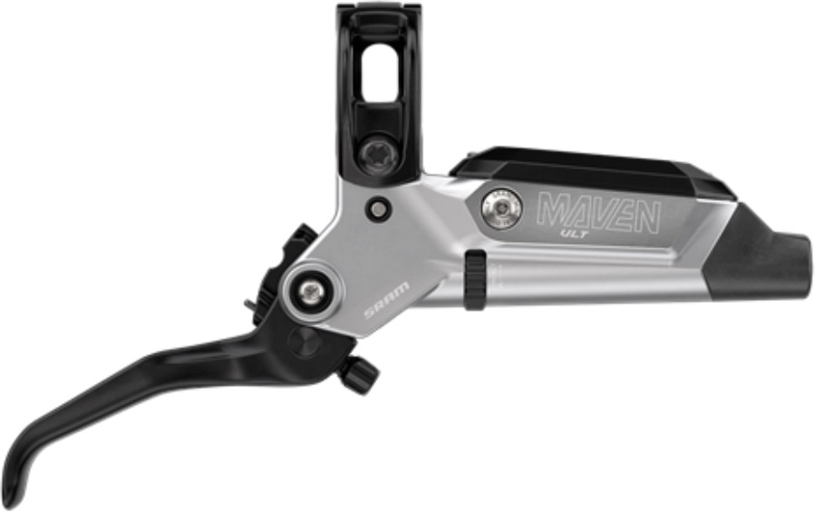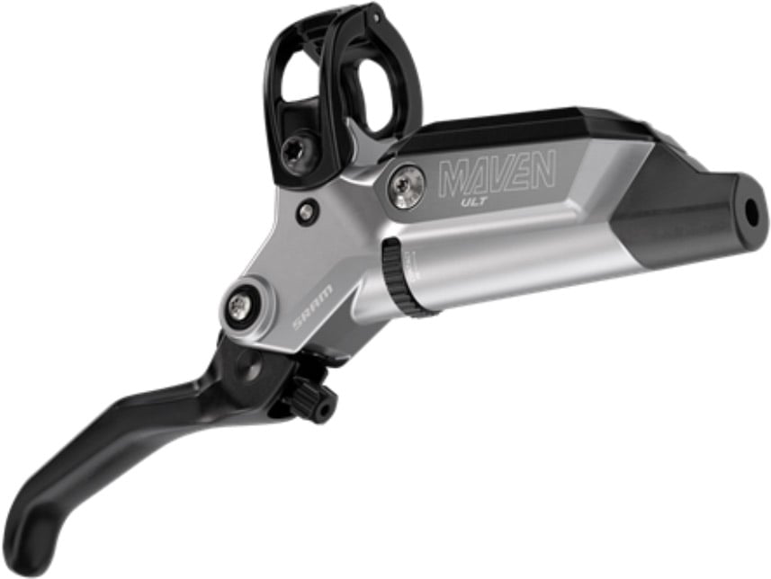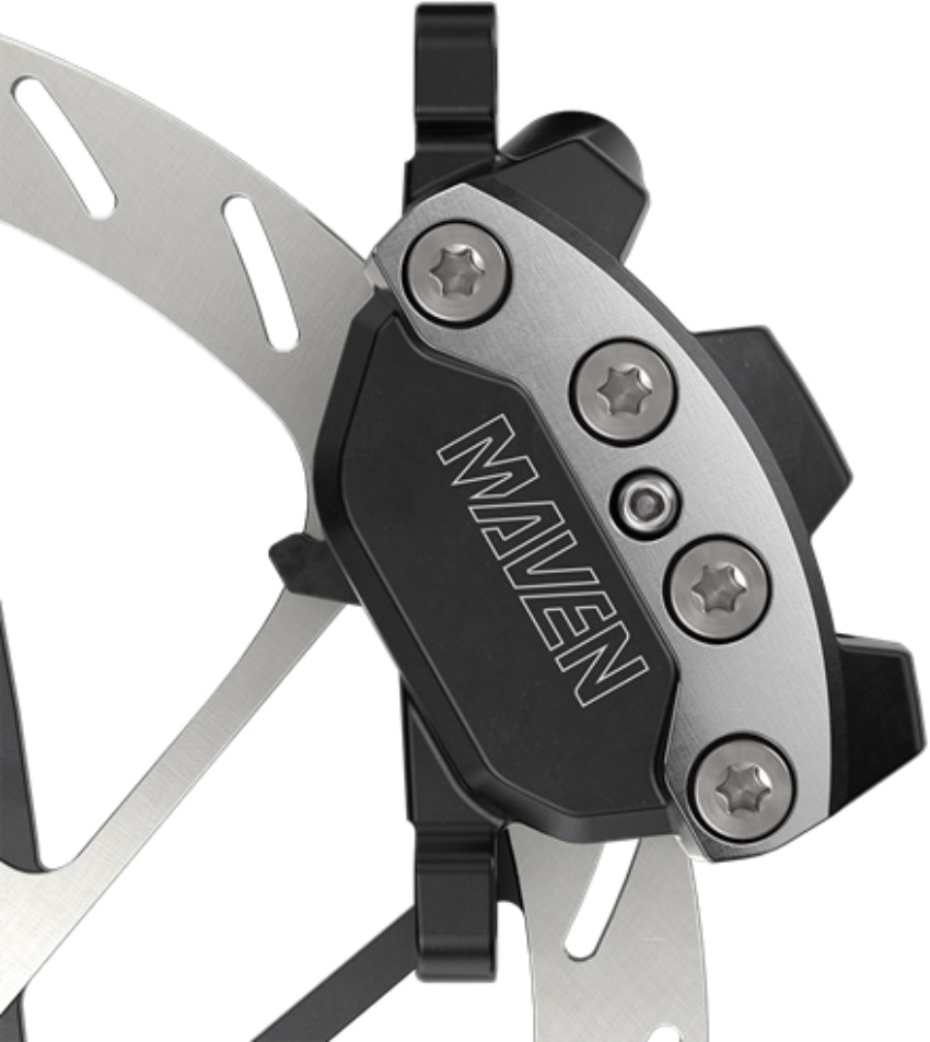 Introducing the SRAM Maven Brakes, the flat-out most powerful brake that SRAM has ever made—and that’s saying something. These Maven Ultimate brakes are the top-level Maven brakes, with a polished brake lever, titanium hardware, and a dream bike-worthy design. The Maven brakes offer even more stopping power than SRAM Code brakes with a steeper power ramp-up, and 32% less brake lever force needed to achieve that same power. But all of that stopping power is nothing without control, which is why the Maven was designed with an optimized SwingLink leverage ratio, for more progressive braking and less of that “on/off” feel, as well as a new mineral oil design for easier servicing without compromising performance. Oversized 18mm and 19.5mm brake pistons and four titanium bolts increase the rigidity of the calipers, for less flex and increased power. The Maven offers more stopping power, more control, and more tunability, all at your fingertips.