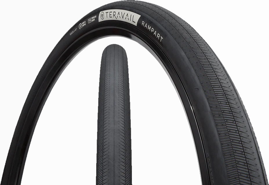 The Teravail Rampart 700c is the ultimate tire for poorly maintained roads, smooth tarmac, and even a touch of gravel—for those rides that take you on unpredictable surfaces. The Rampart features a smooth center tread for straight-line speed and efficiency, paired with a 3-2-1 siping pattern that gradually increases grip when leaning into hard-pack dirt and rough pavement turns. The 1mm thicker center tread of the Rampart increases the wear life and improves puncture resistance, with a tough sidewall that holds up to the worst road conditions. Available in both Light & Supple and Durable casing options, and traditional road or all-road sizes, there’s a version of Rampart for every type of all-road ride.